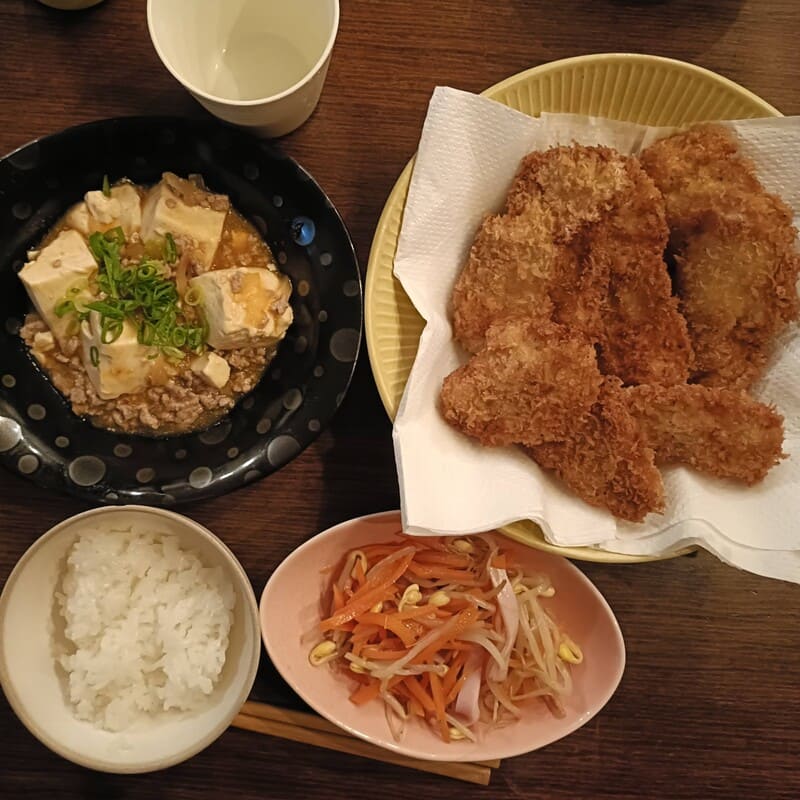 タラのフライと麻婆豆腐。野菜のナムルとごはんでした。
