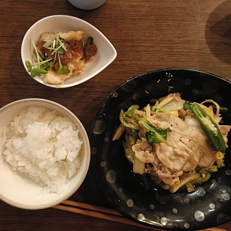 豚肉と白菜の炒め物、鶏ムネ肉の玉ねぎソース、ご飯でした。