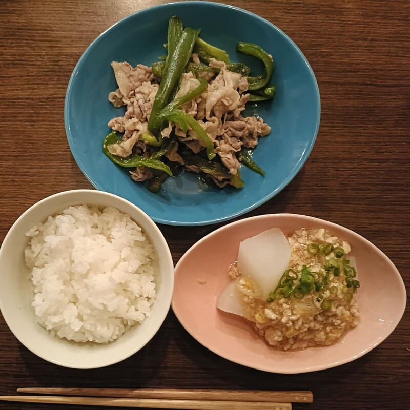 豚肉とピーマンの炒め物、ふろふき大根、ご飯でした。