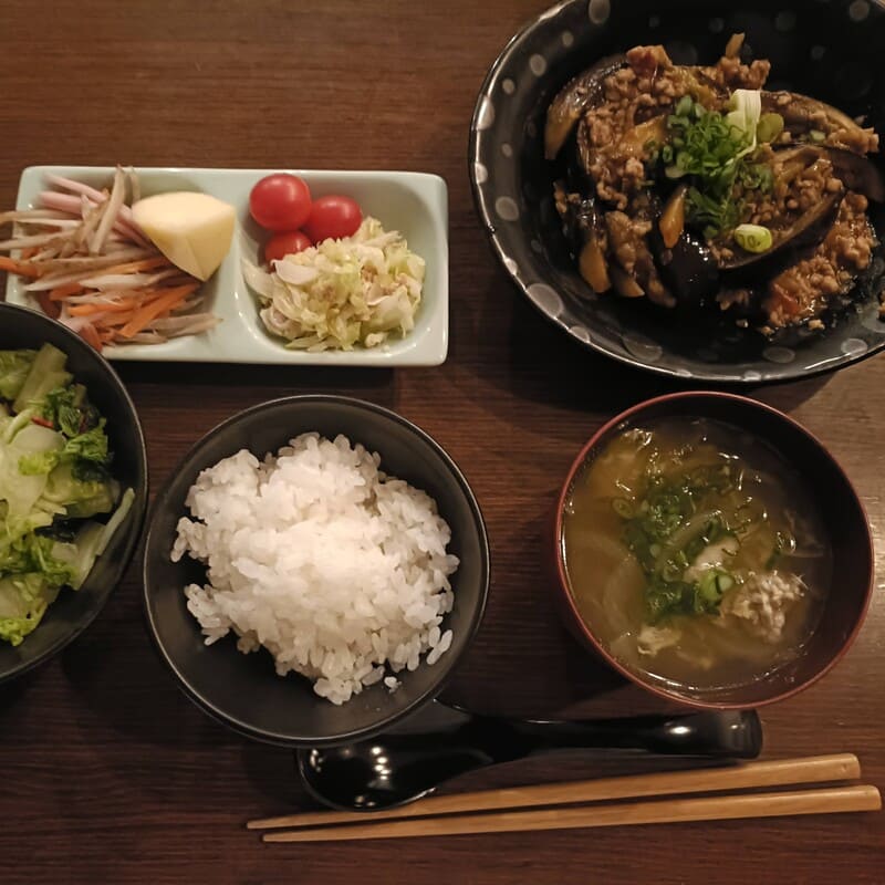 麻婆豆腐と麻婆茄子、ごぼうサラダ、キャベツとツナのサラダ、お肉入中華スープ、白菜の浅漬、ごはんでした。今日は野菜のおかずを多く作った。