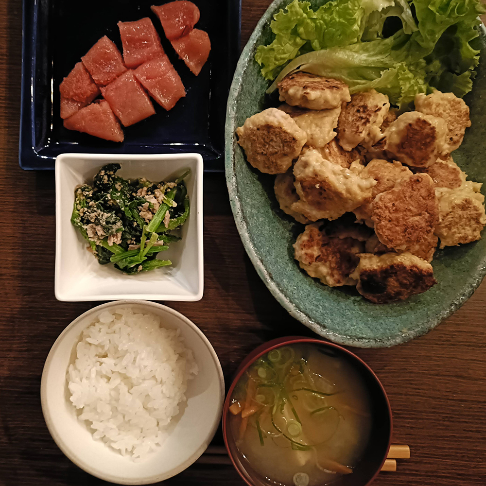 チキンナゲット、ほうれん草とツナの和物、野菜入りお味噌汁、ごはんでした